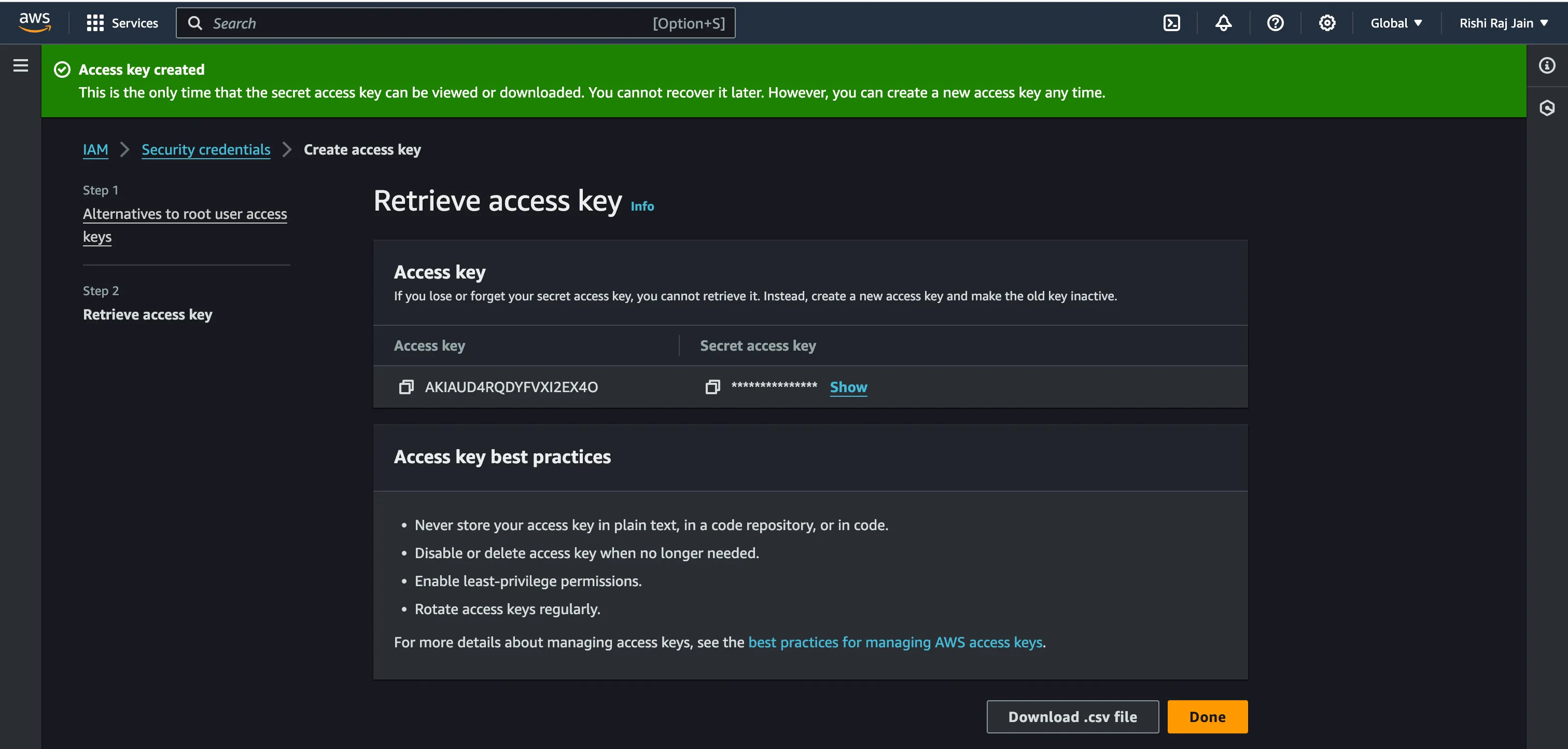 Copy the Access key and Secret access key, you will add them to your Next.js project later.